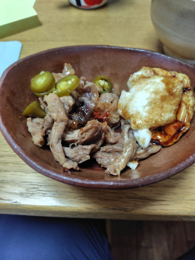 さっと焼いただけの豚肉と卵ですが、ここにハラペーニョのピクルスを乗せると一気に雰囲気が変わります。