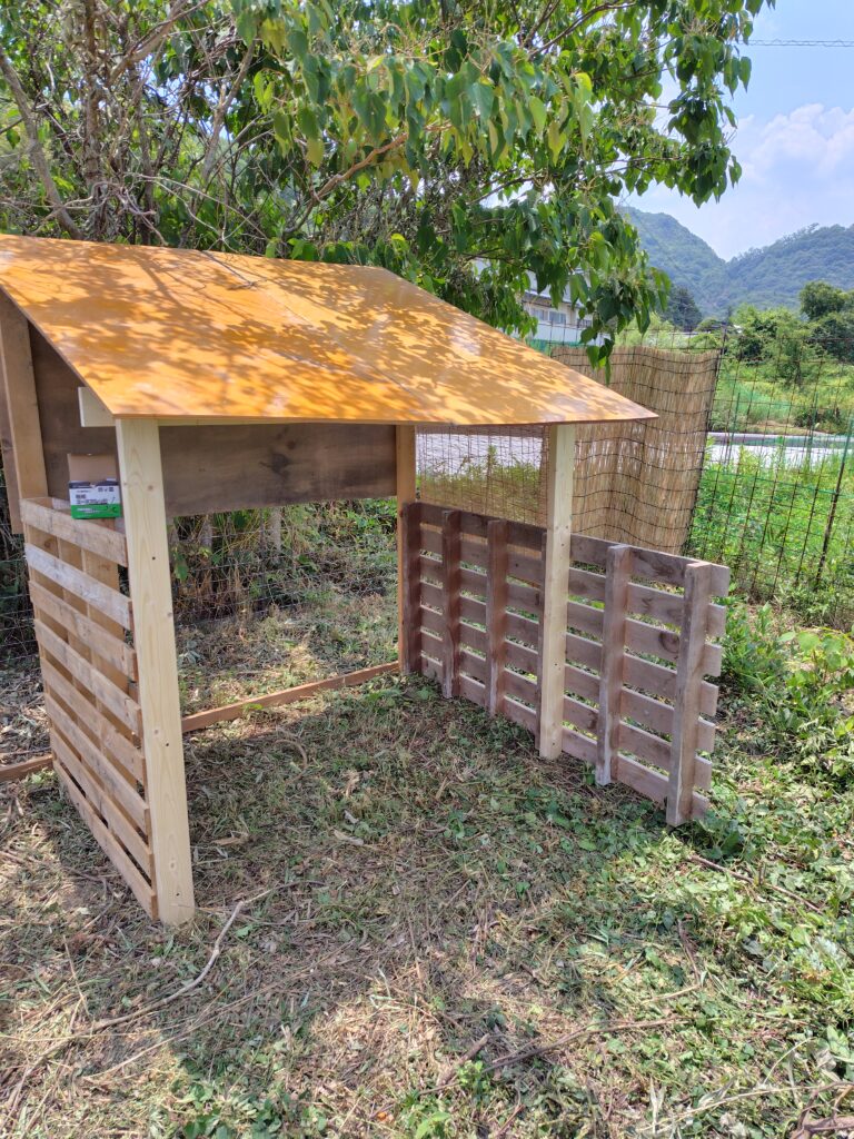 そしてこれが新しく作った日除け小屋です。もらったパレットも活用しながら作りました。