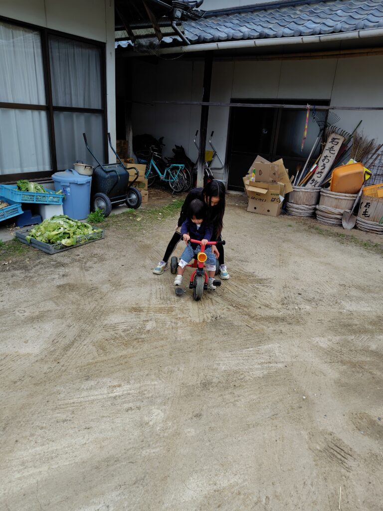 自転車に向けての三輪車は、残念ながら足がまだ届かないので押してもらっています。