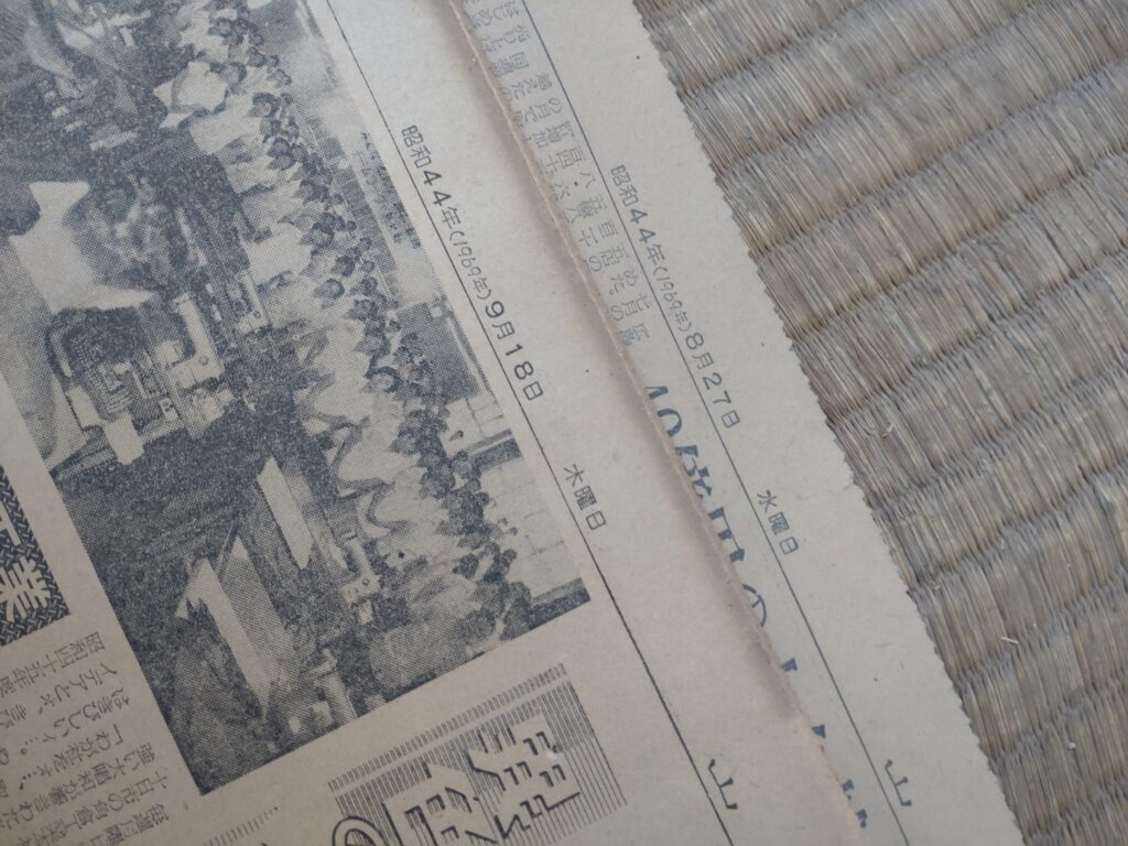 自宅の2階の部屋は最初使う勇気も出ないくらいぶよぶよの畳があり、それをめくるとこんな新聞がたくさん敷かれていました。
