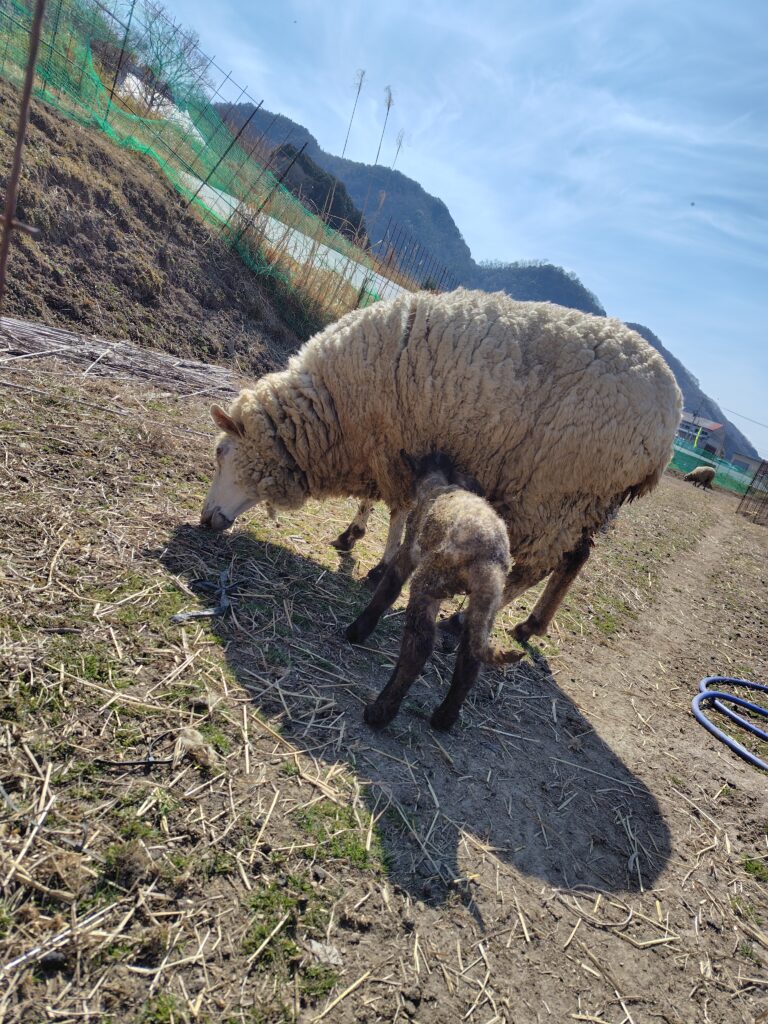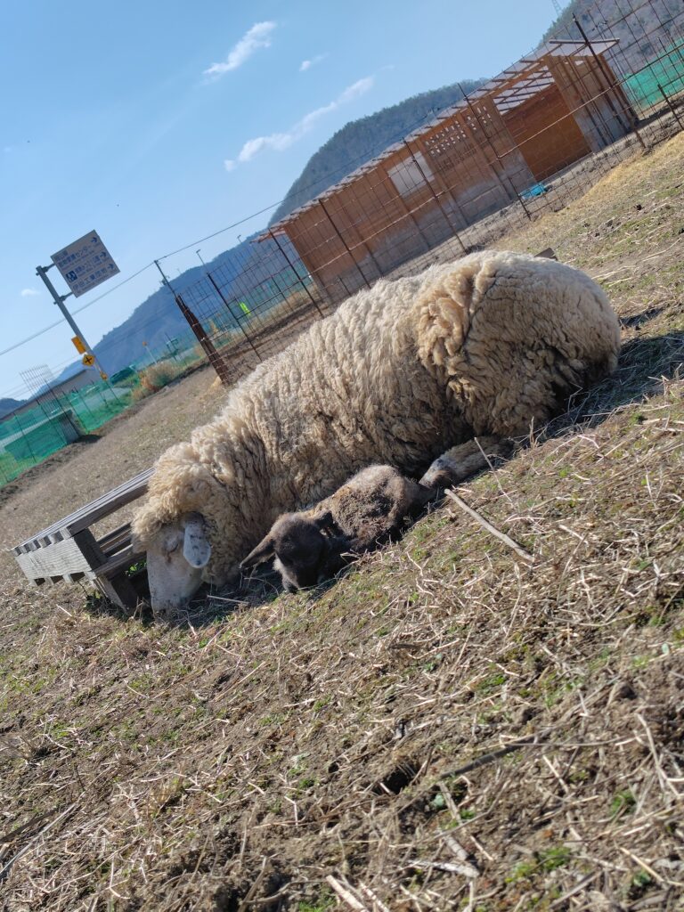 こんな時奥さんはさすがです!離れたところから子羊と『いちご』の様子を観察し、しっかり生まれた子を舐めていることや、息をしていることなど一通り観察してくれました。