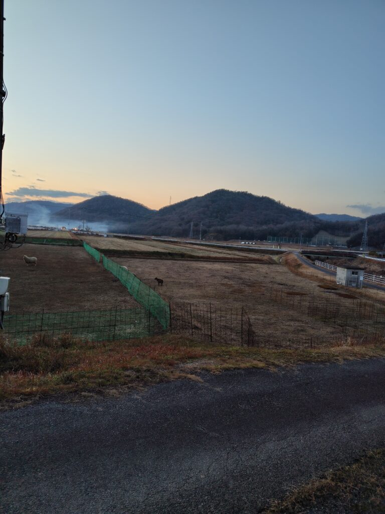 作業をしているとヒツジとヤギが集まってきたので、ゴシゴシしようとしたら、逃げた時の写真です。