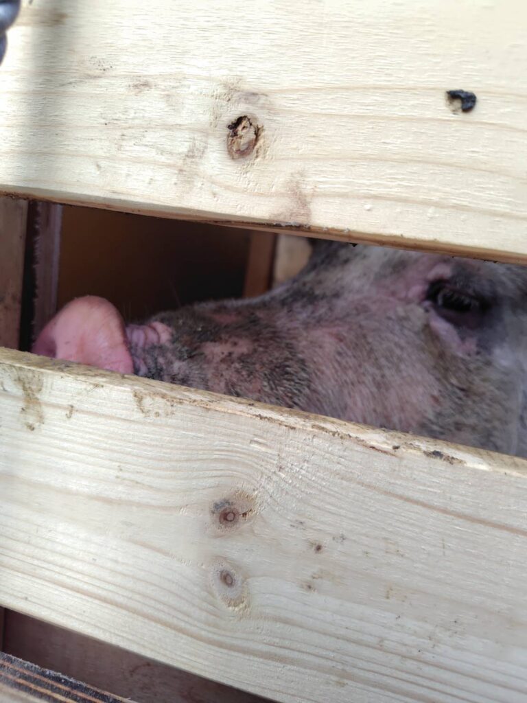 これまでのバークシャー種との違いがどのように出るのかわかりませんが、この子はとてもやさしい子でした。臆病なのでなかなか台車にも乗れなかったのですが、最後押し込むような形になっても噛むこともなく、優しく臆病な性格だったのでしょう。